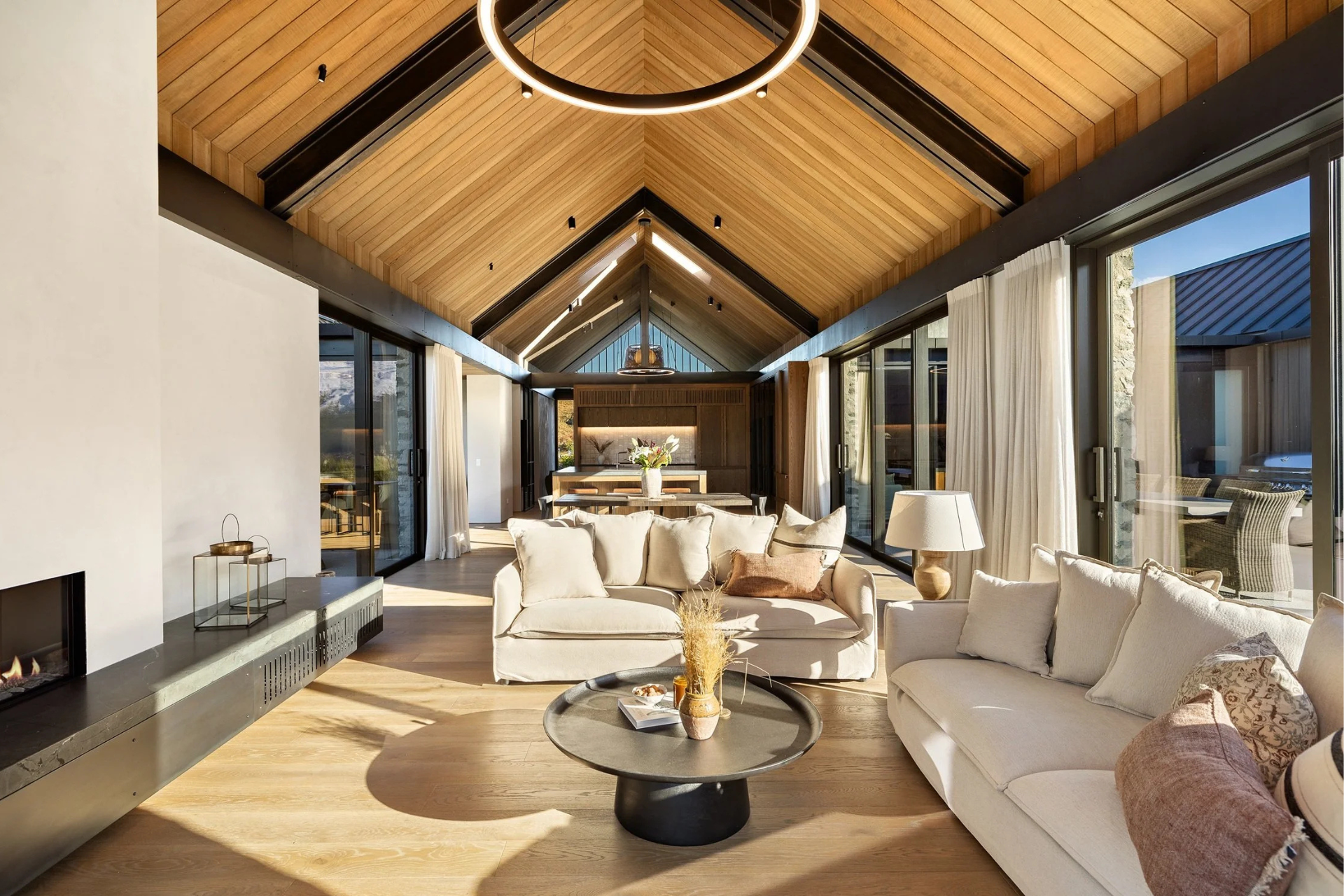 An expansive open-plan kitchen, dining and living space extends to an outdoor entertaining area, featuring a Corten steel fireplace, built-in barbecue and landscaped gardens.